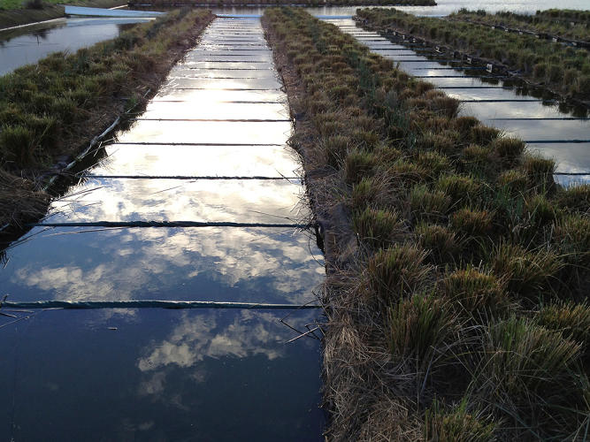Floating islands are designed to grow "biofilms"—collections of microbes that consume the excessive nutrients in the water. Each platform is made up of a matrix of fibers derived from post-consumer plastic bottles, then infused with a buoyant marine foam. The plants on top, mostly perennials, grow in a peat layer. The biofilms congregate on the bottom of the structure, while roots from the plants peep through, offering additional pollution control.